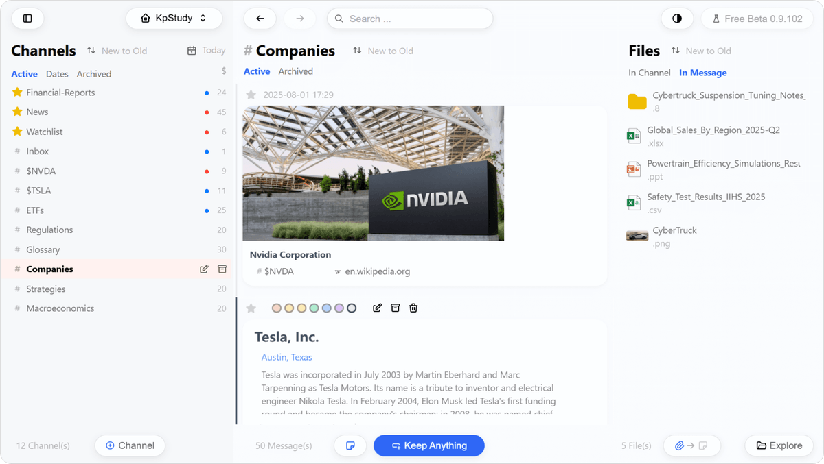 Keeplyst Messages can belong to multiple Channels, making cross-referencing effortless and flexible.